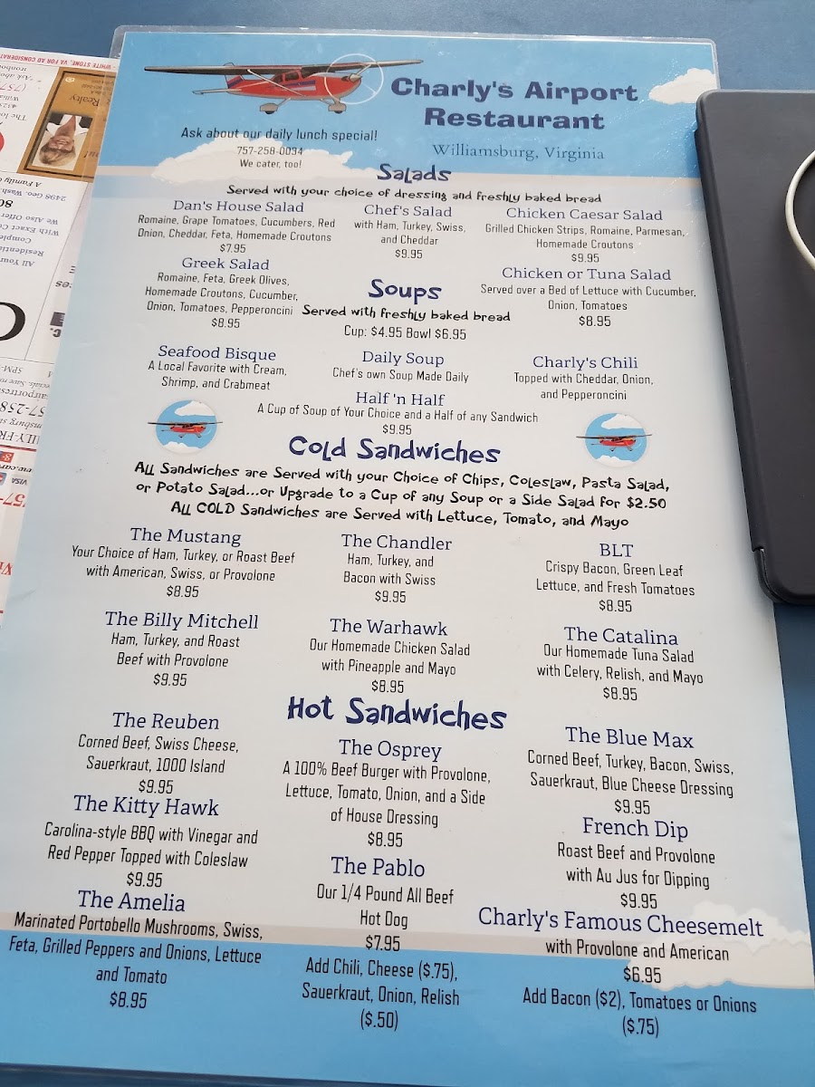 Welcome to Charly's Airport Restaurant, a delightful spot located at 100 Marclay Dr, Williamsburg, VA. This charming eatery offers a unique dining experience where you can enjoy your meal while watching planes take off and land. The menu is thoughtfully curated to include a variety of options that cater to diverse tastes.